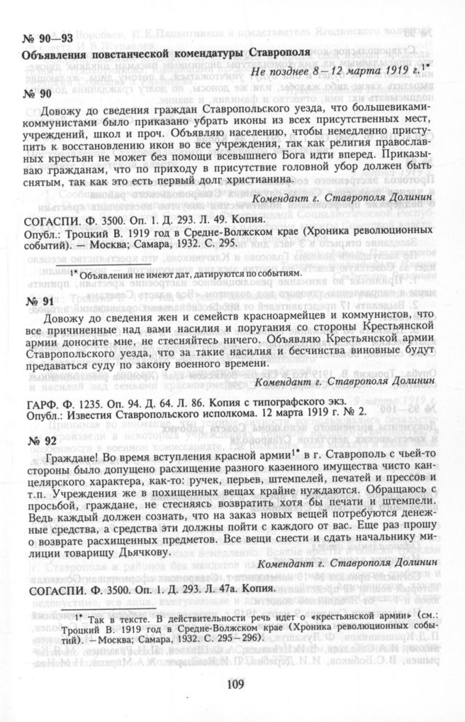 «Чапанная война» 3 — 15 марта 1919 г. «Чапанная война». Документы повстанцев 8 — 12 марта 1919 г. Объявления повстанческой комендатуры Ставрополя. Не позднее 8 — 12 марта 1919 г. № 92