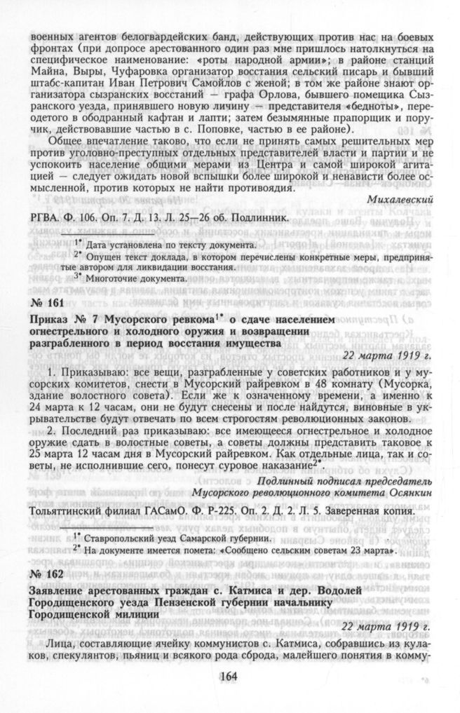 Конец «чапанной войны» 17 — 28 марта 1919 г. Приказ № 7 Мусорского ревкома о сдаче населением огнестрельного и холодного оружия и возвращении разграбленного в период восстания имущества. 22 марта 1919 г. // Тольяттинский филиал ГАСамО. Ф. Р-225. Оп. 2. Д. 2. Л. 5. Заверенная копия.