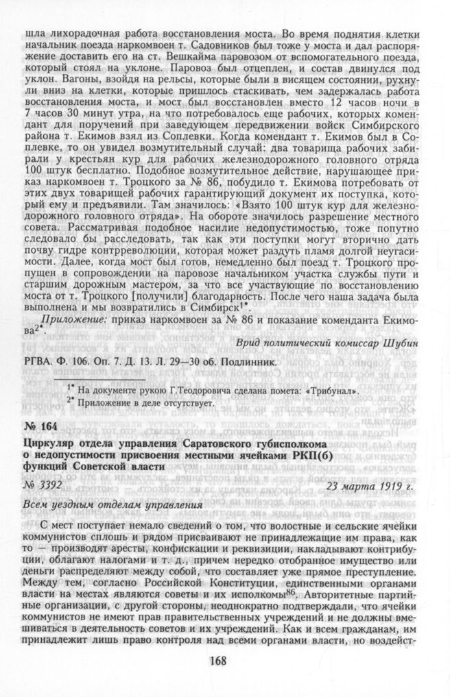 Конец «чапанной войны» 17 — 28 марта 1919 г. Циркуляр отдела управления Саратовского губисполкома о недопустимости присвоения местными ячейками РКП(б) функций Советской власти. 23 марта 1919 г. // ГАПО. Ф. Р-1897. Oп. 1. Д. 78. Л. 231—231 об. Машинописная копия.; ЦДНИСО. Ф. 104. Oп. 1. Д. 11. Л. 1 —1 об. Рукописная копия.