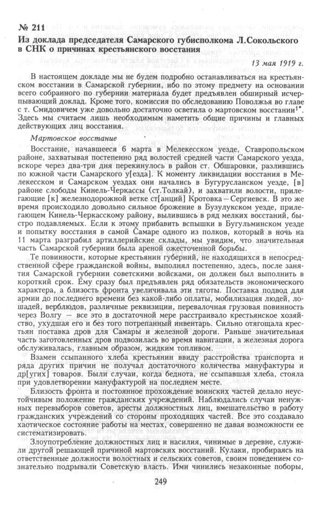 Из доклада председателя Самарского губисполкома Л.Сокольского в СНК о причинах крестьянского восстания. 13 мая 1919 г. // ГА РФ. Ф. 130. Оп. 3. Д. 363. Л. 55—56. Подлинник.