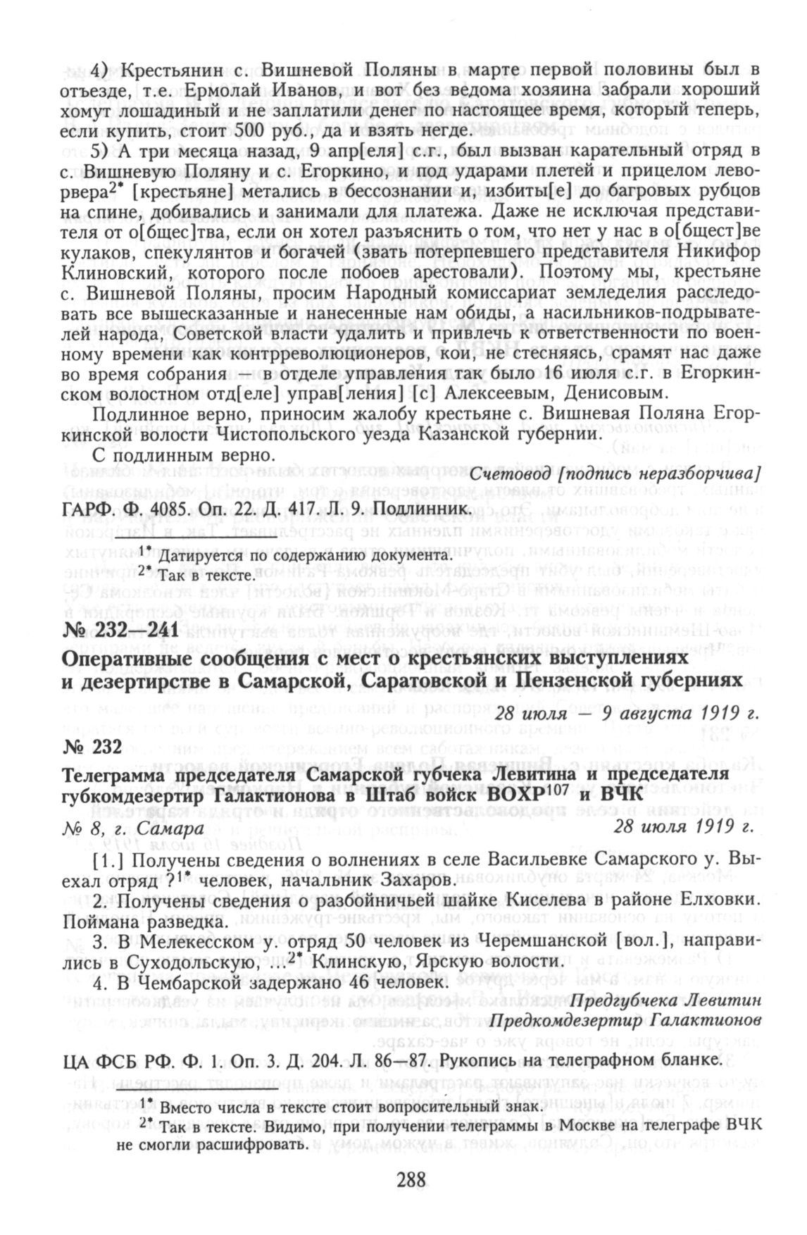 Оперативные сообщения с мест о крестьянских выступлениях и дезертирстве в Самарской, Саратовской и Пензенской губерниях 28 июля — 9 августа 1919 г. Телеграмма председателя Самарской губчека Левитина и председателя губкомдезертир Галактионова в Штаб войск ВОХР и ВЧК. 28 июля 1919 г. // ЦА ФСБ РФ. Ф. 1. Оп. 3. Д. 204. Л. 86—87. Рукопись на телеграфном бланке.
