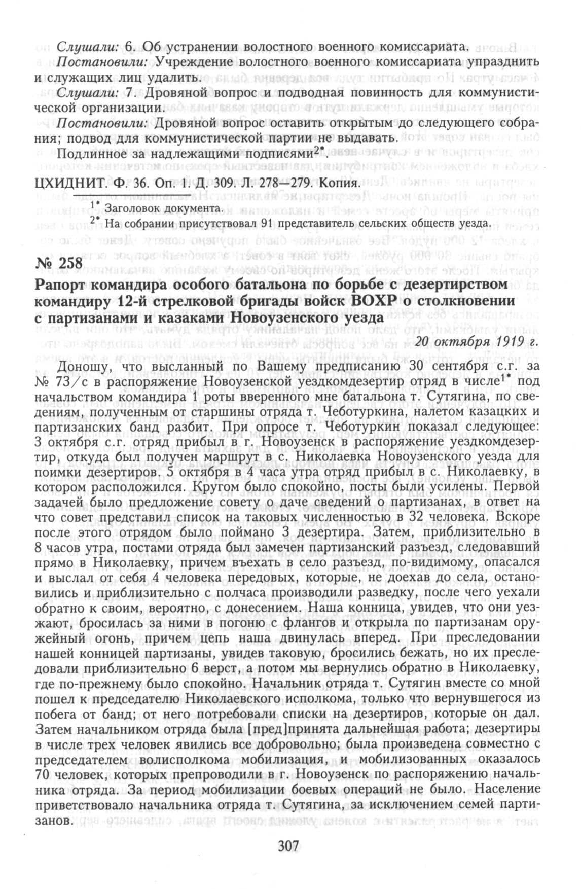 Рапорт командира особого батальона по борьбе с дезертирством командиру 12-й стрелковой бригады войск ВОХР о столкновении с партизанами и казаками Новоузенского уезда. 20 октября 1919 г. // РГВА. Ф. 42. Oп. 1. Д. 1874. Л. 36—36 об. Заверенная копия с заверенной копии.