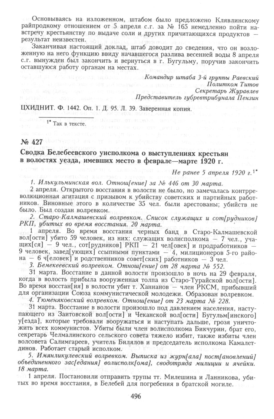 Сводка Белебеевского уисполкома о выступлениях крестьян в волостях уезда, имевших место в феврале—марте 1920 г. Не ранее 5 апреля 1920 г. // ЦГИА РБ. Ф. 396. Oп. 1. Д. 106. Л. 9—10 об. Подлинник.