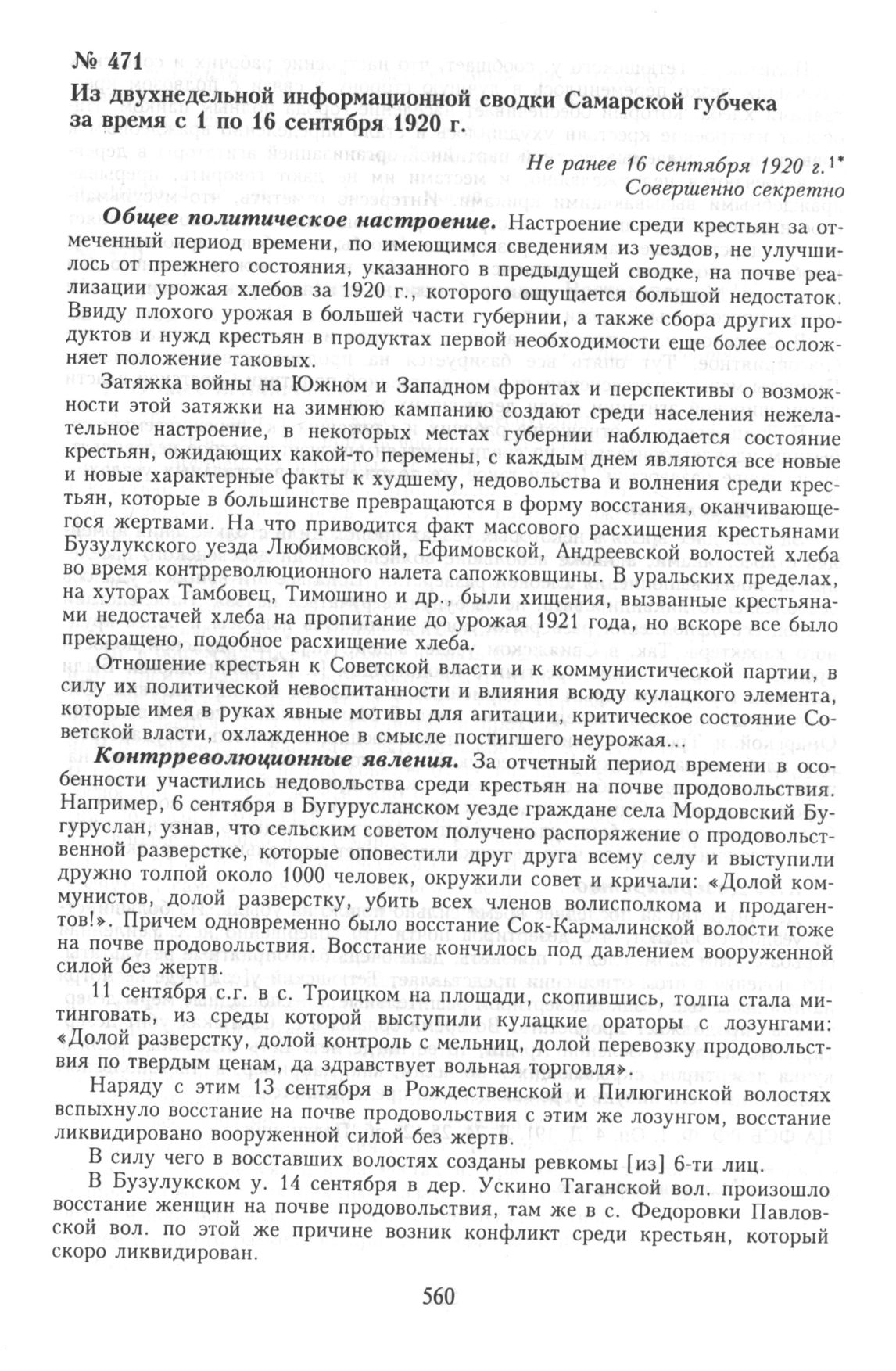 Из двухнедельной информационной сводки Самарской губчека за время с 1 по 16 сентября 1920 г. Не ранее 16 сентября 1920 г. // ЦА ФСБ РФ. Ф. 1. Оп. 4. Д. 221. Л. 21—21 об. Подлинник.; Советская деревня глазами ВЧК—ОГПУ—НКВД / Т. 1. С. 319—320.
