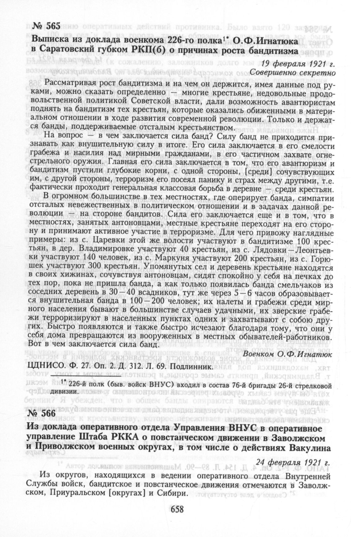 Выписка из доклада военкома 226-го полка О.Ф.Игнатюка в Саратовский губком РКП(б) о причинах роста бандитизма. 19 февраля 1921 г. // ЦДНИСО. Ф. 27. Оп. 2. Д. 312. Л. 69. Подлинник.