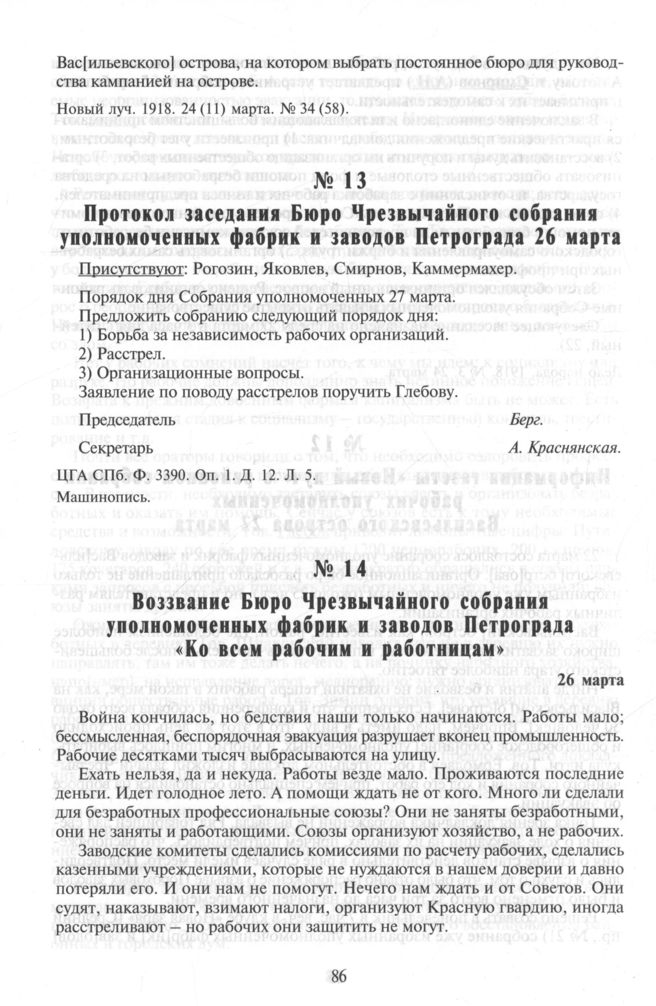 Воззвание Бюро Чрезвычайного собрания уполномоченных фабрик и заводов Петрограда «Ко всем рабочим и работницам». 26 марта // Дело народа. 1918. № 5. 27 марта; Новая жизнь. 1918. № 51 (266). 26 (13) марта; Новый луч. 1918. № 35 (59). 26 (13) марта; Независимое рабочее движение в 1918 году. С. 63-64.