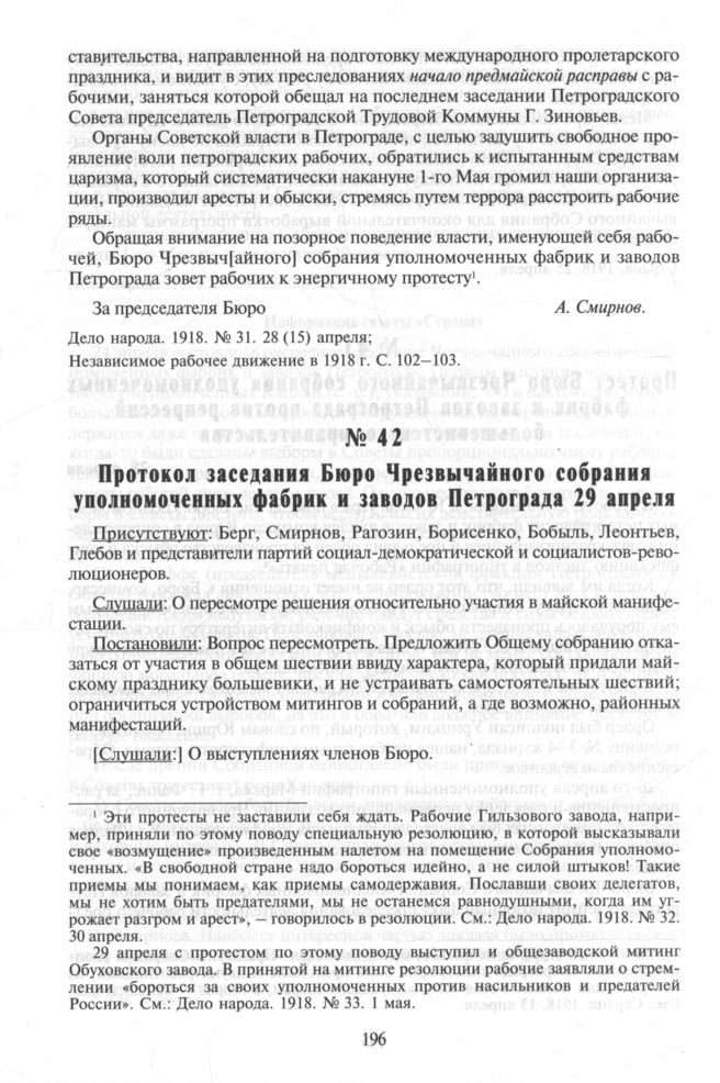 Протокол заседания Бюро Чрезвычайного собрания уполномоченных фабрик и заводов Петрограда 29 апреля // ЦГА СПб. Ф. 3390. Оп. 1.Д. 12. Л. 20. Машинопис. подлинник; Питерские рабочие и «диктатура пролетариата». С. 89.