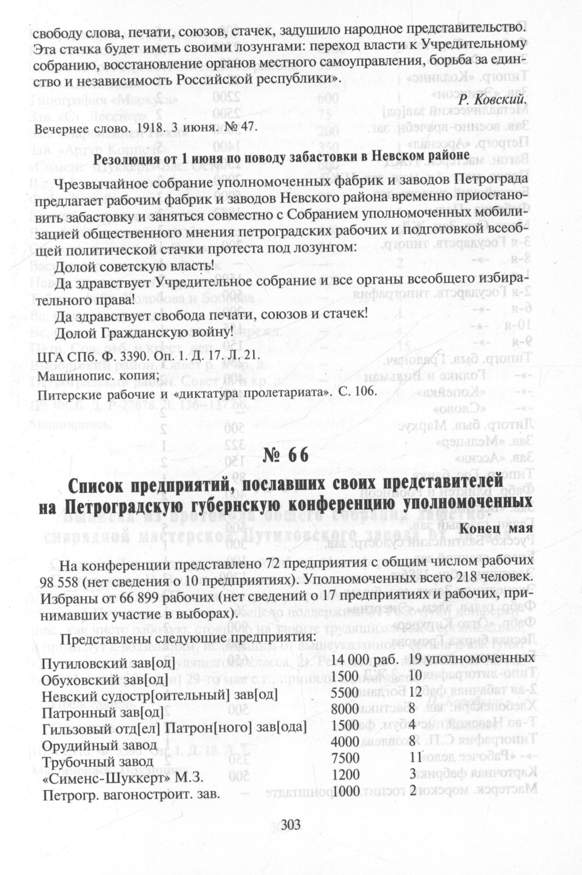 Материалы XIV и XV заседаний Чрезвычайного собранияуполномоченных фабрик и заводов Петрограда 29 мая - 1 июня. Резолюция от 1 июня по поводу забастовки в Невском районе // ЦГА СПб. Ф. 3390. Оп. 1.Д. 17. Л. 21. Машинопис. копия; Питерские рабочие и «диктатура пролетариата». С. 106.