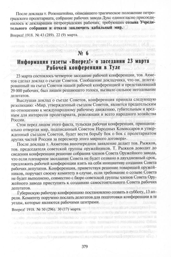 Информация газеты «Вперед!» о заседании 23 марта Рабочей конференции в Туле // Вперед! 1918. № 50 (296). 30 (17) марта.