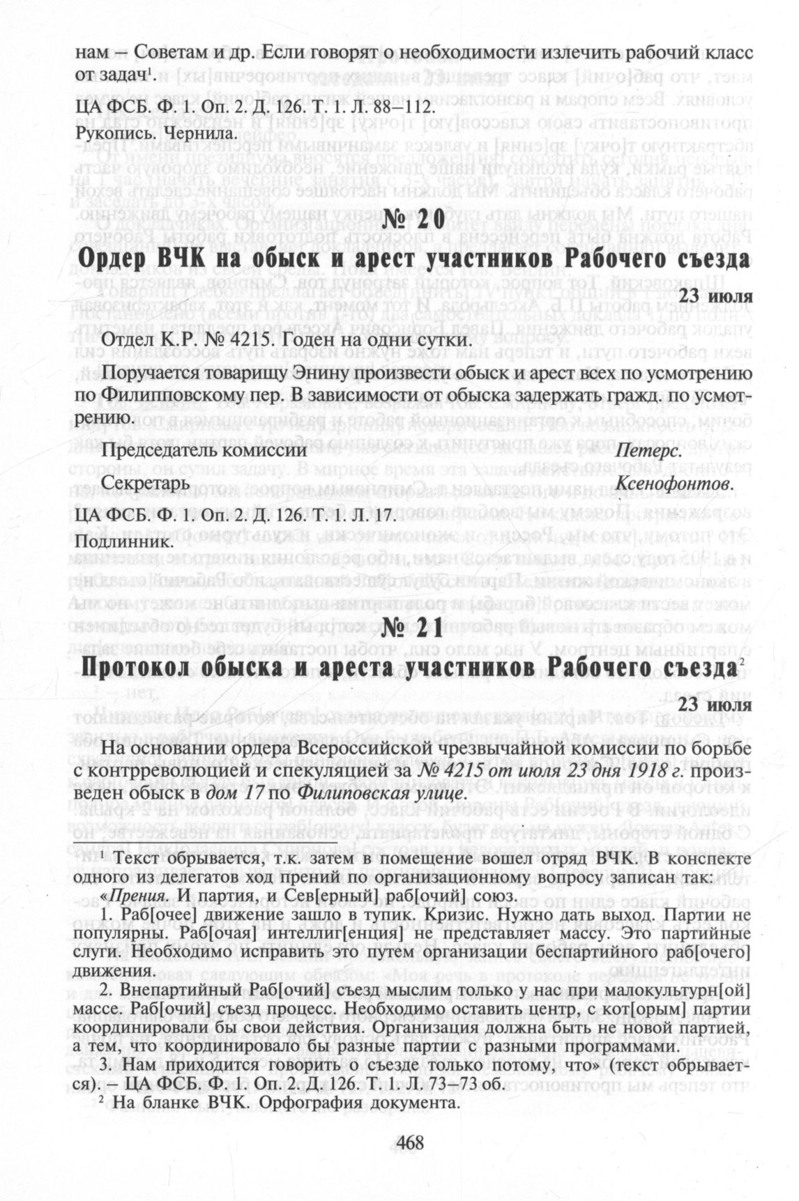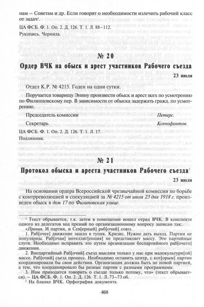 Ордер ВЧК на обыск и арест участников Рабочего съезда. 23 июля