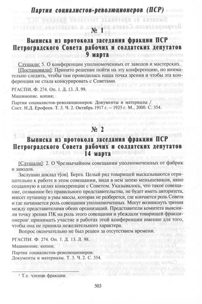 Выписка из протокола заседания фракции ПСР Петроградского Совета рабочих и солдатских депутатов 9 марта // РГАСПИ. Ф. 274. Оп. 1. Д. 13. Л. 99. Машинопис. копия; Партия социалистов-революционеров. Документы и материалы / Сост. Н.Д. Ерофеев. Т. 3. Ч. 2. Октябрь 1917 г. - 1925 г. М., 2000. С. 354.