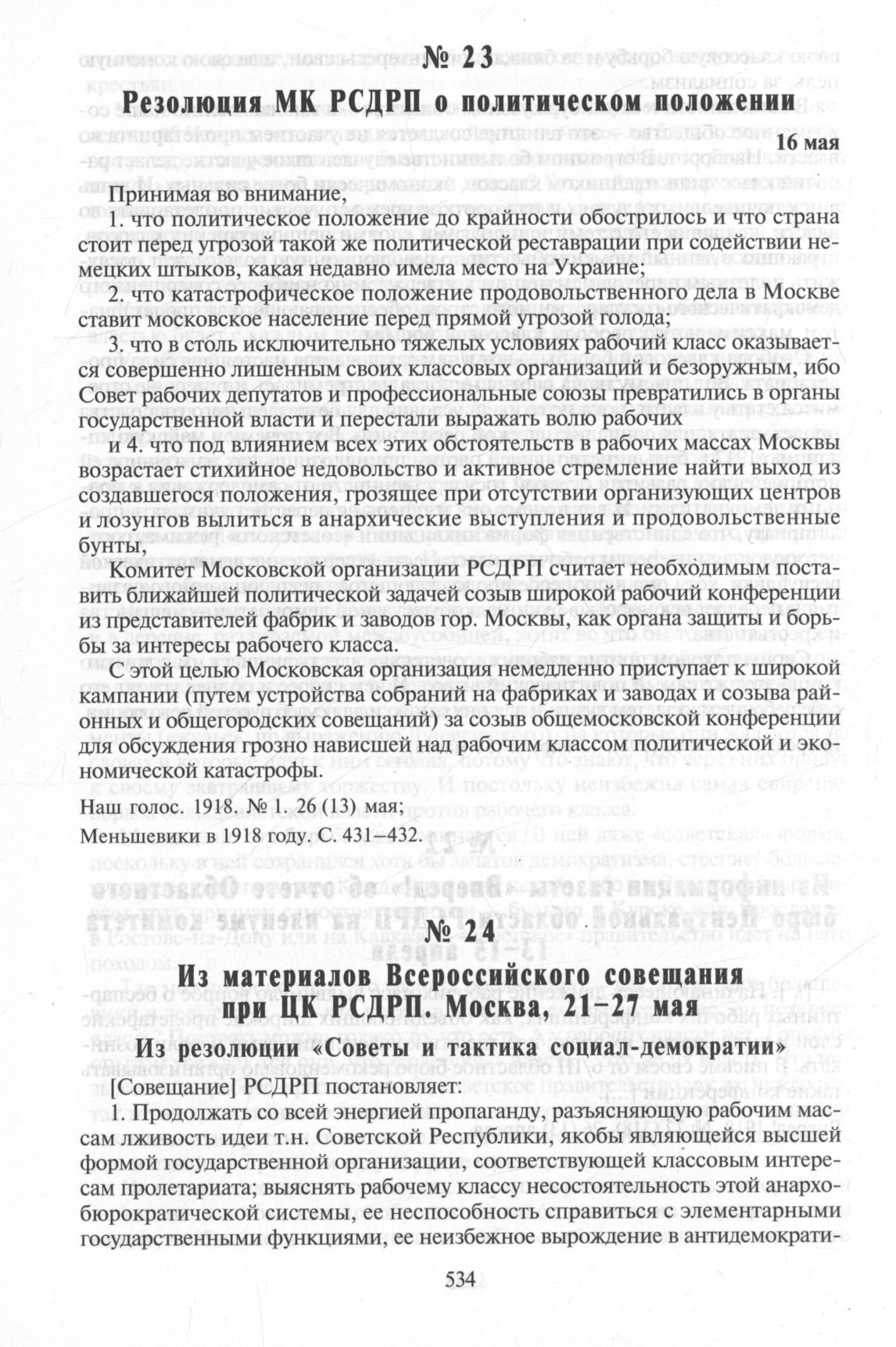 Из материалов Всероссийского совещания при ЦК РСДРП. Москва, 21-27 мая. Из резолюции «Советы и тактика социал-демократии» // ЦА ФСБ. Д. Р-27678. Т. 1. Л. 146-148. Гектограф; РГАСПИ. Ф. 275. Оп. 1. Д. 56. Л. 17-19. Машинопис. копия; Новая заря. 1918. № 5—6. 10 июня; Меньшевики в 1918 году. С. 480-481.