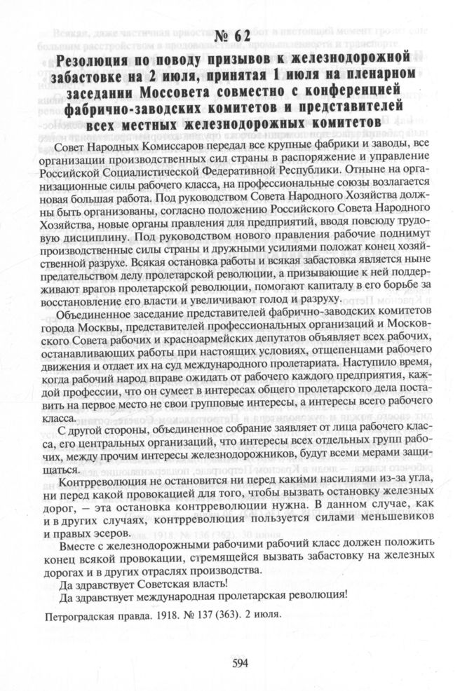 Резолюция по поводу призывов к железнодорожной забастовке на 2 июля, принятая 1 июля на пленарном заседании Моссовета совместно с конференцией фабрично-заводских комитетов и представителей всех местных железнодорожных комитетов // Петроградская правда. 1918. № 137 (363). 2 июля.