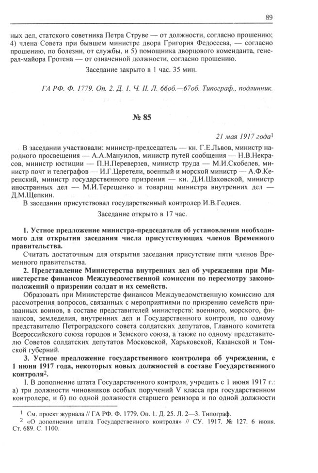 Журнал заседания Временного правительства № 85. 21 мая 1917 года // ГА РФ. Ф. 1779. Оп. 2. Д. 1. Ч. II. Л. 68—69. Типограф., подлинник.