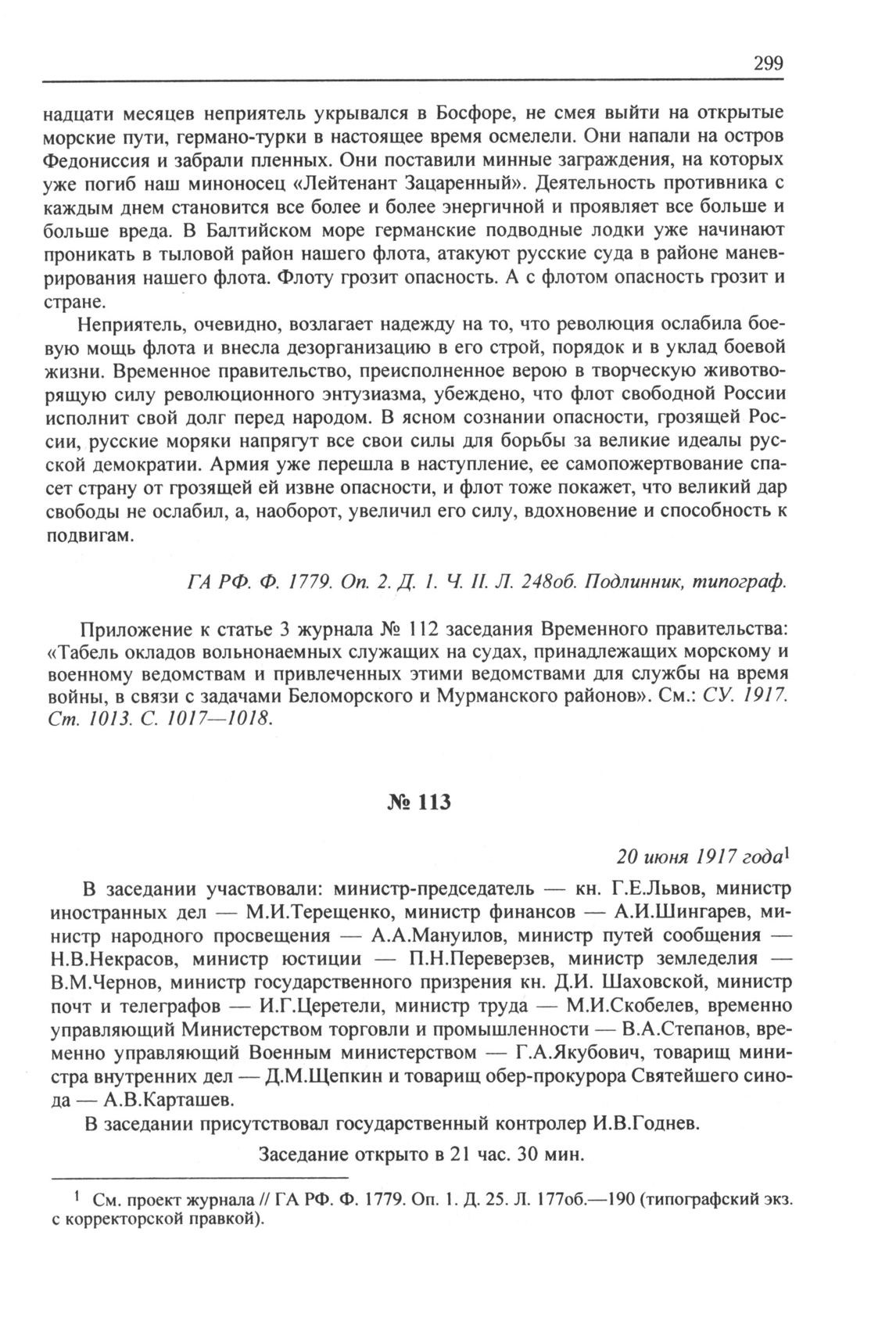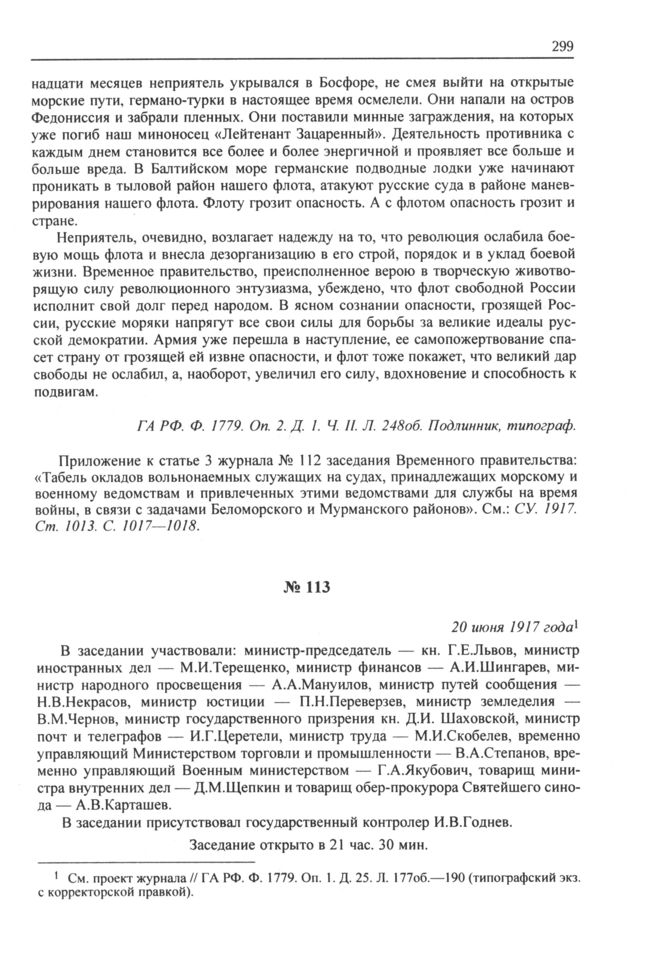 Журнал заседания Временного правительства № 113. 20 июня 1917 года // ГА РФ. Ф. 1779. Оп. 2. Д. 1. Ч. II. Л. 251об.—264. Типограф., подлинник.