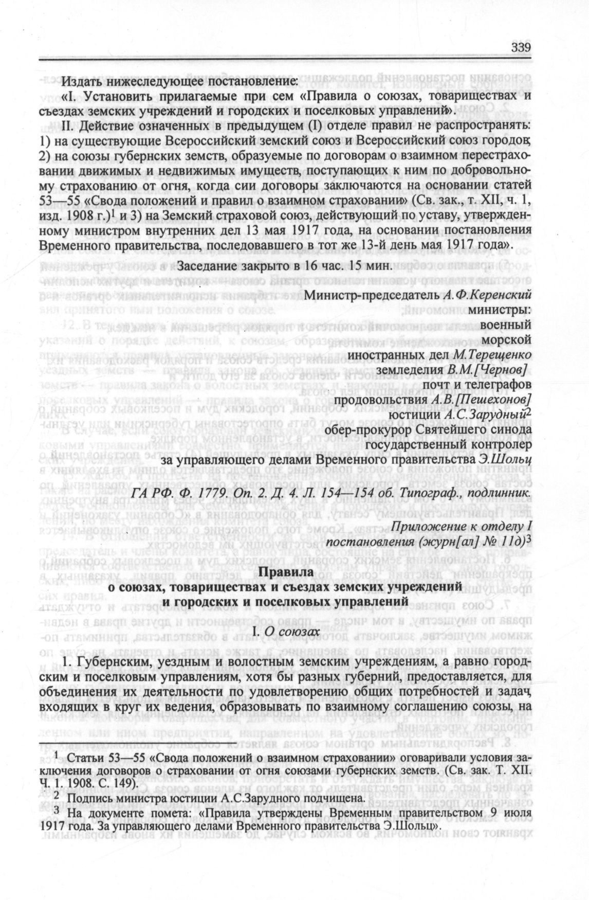 Особый журнал заседания Временного правительства № 11 д. 9 июля 1917 года. Приложение к отделу I постановления (журн[ал] № 11 д). Правила о союзах, товариществах и съездах земских учреждений и городских и поселковых управлений // ГА РФ. Ф. 1779. Оп. 2. Д. 4. Л. 155—156 об. Типограф., подлинник.