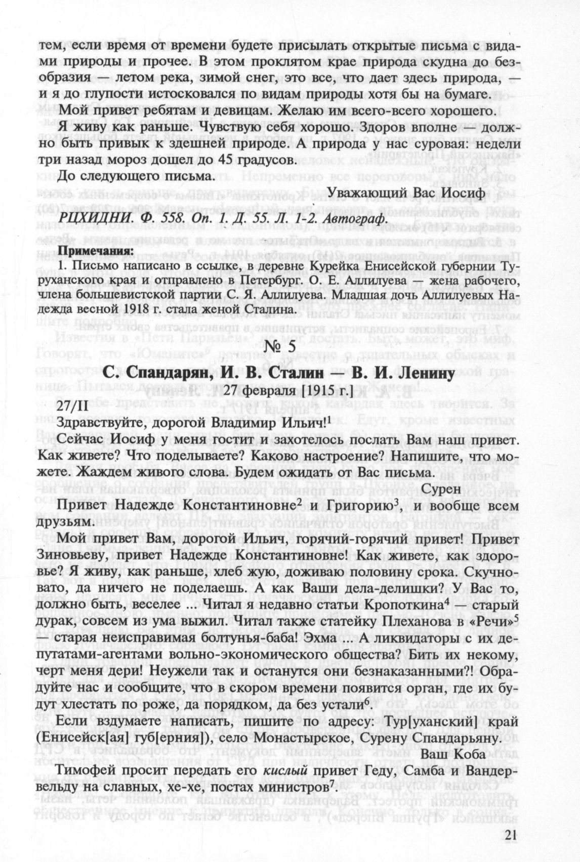 С. Спандарян, И. В. Сталин — В. И. Ленину. 27 февраля [1915 г.] // РЦХИДНИ. Ф. 558. Oп. 1. Д. 53. Л. 1-3. Автографы. «Пролетарская революция». 1936. № 7. С. 167.