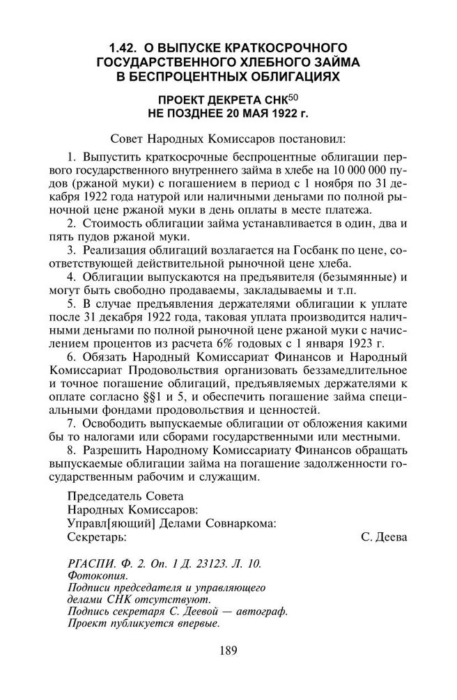 О выпуске краткосрочного государственного хлебного займа в беспроцентных облигациях. Проект декрета СНК. Не позднее 20 мая 1922 г. // РГАСПИ. Ф. 2. Оп. 1. Д. 23123. Л. 10. Фотокопия. Подписи председателя и управляющего делами СНК отсутствуют. Подпись секретаря С. Деевой - автограф. Проект публикуется впервые.