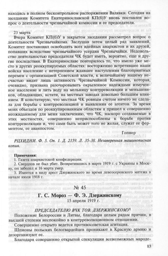 Г. С. Мороз — Ф. Э. Дзержинскому. 15 апреля 1919 г. // РЦХИДНИ. Ф. 17. Оп. 66. Д. 65. Л. 23 а. Машинописная копия.