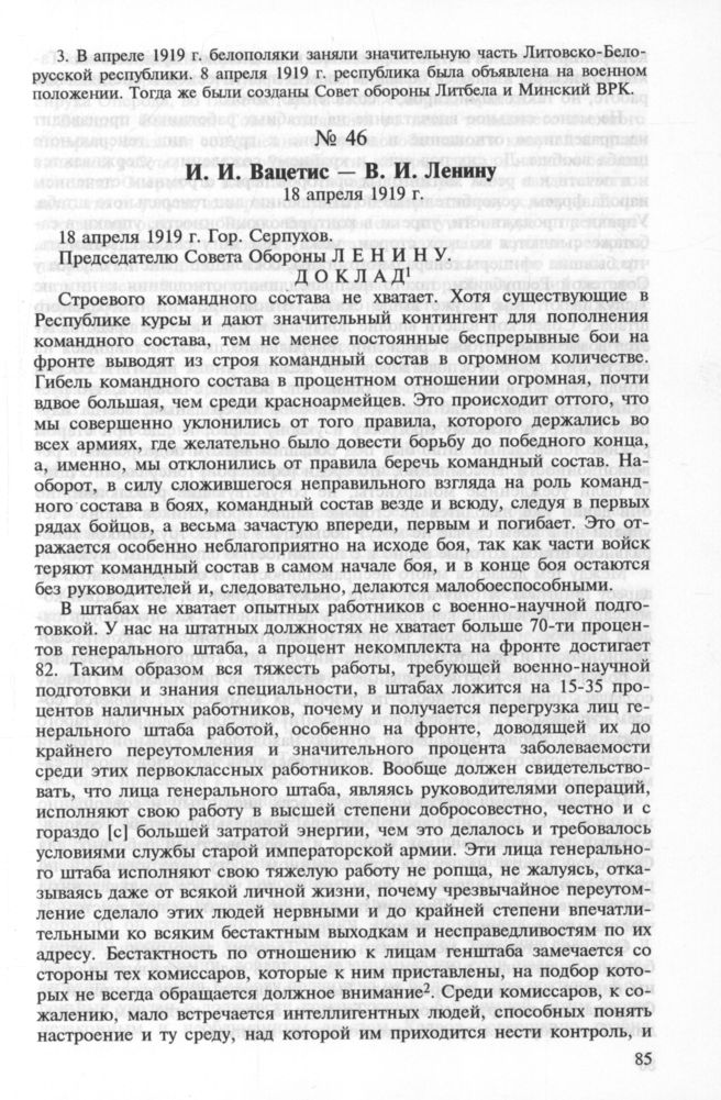 И. И. Вацетис — В. И. Ленину. 18 апреля 1919 г. // РЦХИДНИ. Ф. 17. Oп. 109. Д. 41. Л. 6-10. Машинописный текст.