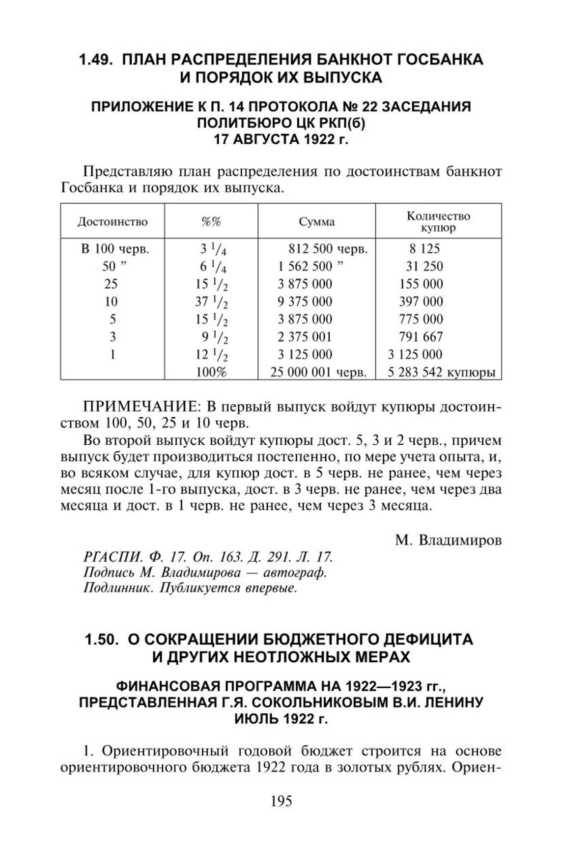 План распределения банкнот Госбанка и порядок их выпуска. Приложение к п. 14 протокола № 22 заседания Политбюро ЦК РКП(б). 17 августа 1922 г.