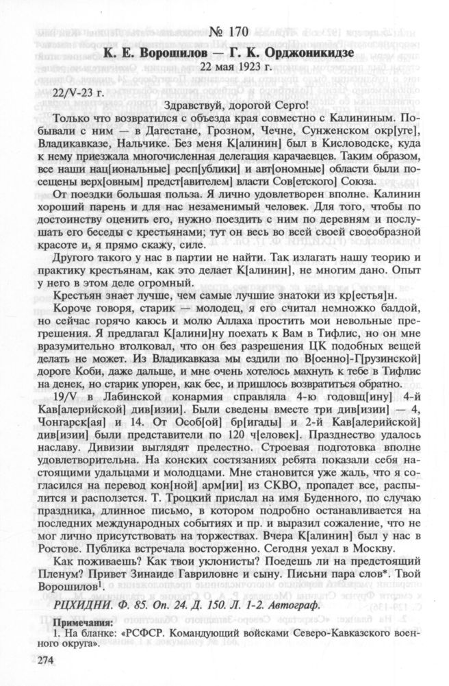 К. Е. Ворошилов — Г. К. Орджоникидзе. 22 мая 1923 г. // РЦХИДНИ. Ф. 85. Oп. 24. Д. 150. Л. 1-2. Автограф.