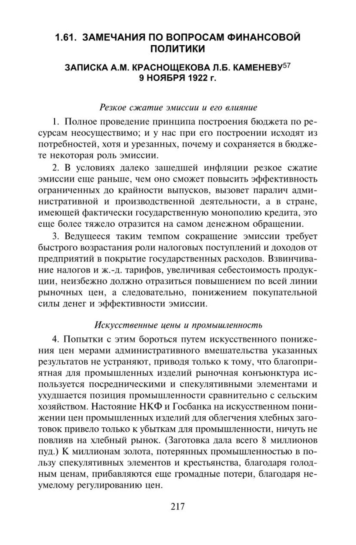 Замечания по вопросам финансовой политики. Записка А.М. Краснощекова Л.Б. Каменеву. 9 ноября 1922 г. // РГАСПИ. Ф. 5. Оп. 1. Д. 1083. Лл. 5-9. Машинописная копия. Публикуется впервые.