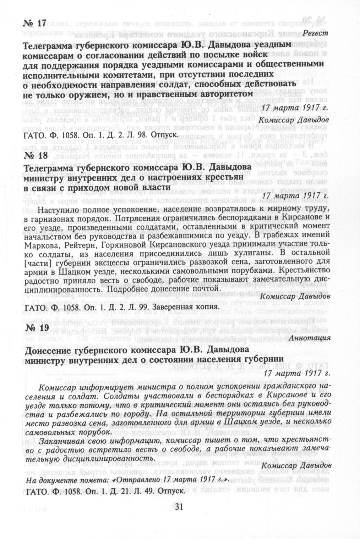 Донесение губернского комиссара Ю.В. Давыдова министру внутренних дел о состоянии населения губернии. 17 марта 1917 г. // ГАТО. Ф. 1058. Оп. 1. Д. 21. Л. 49. Отпуск.