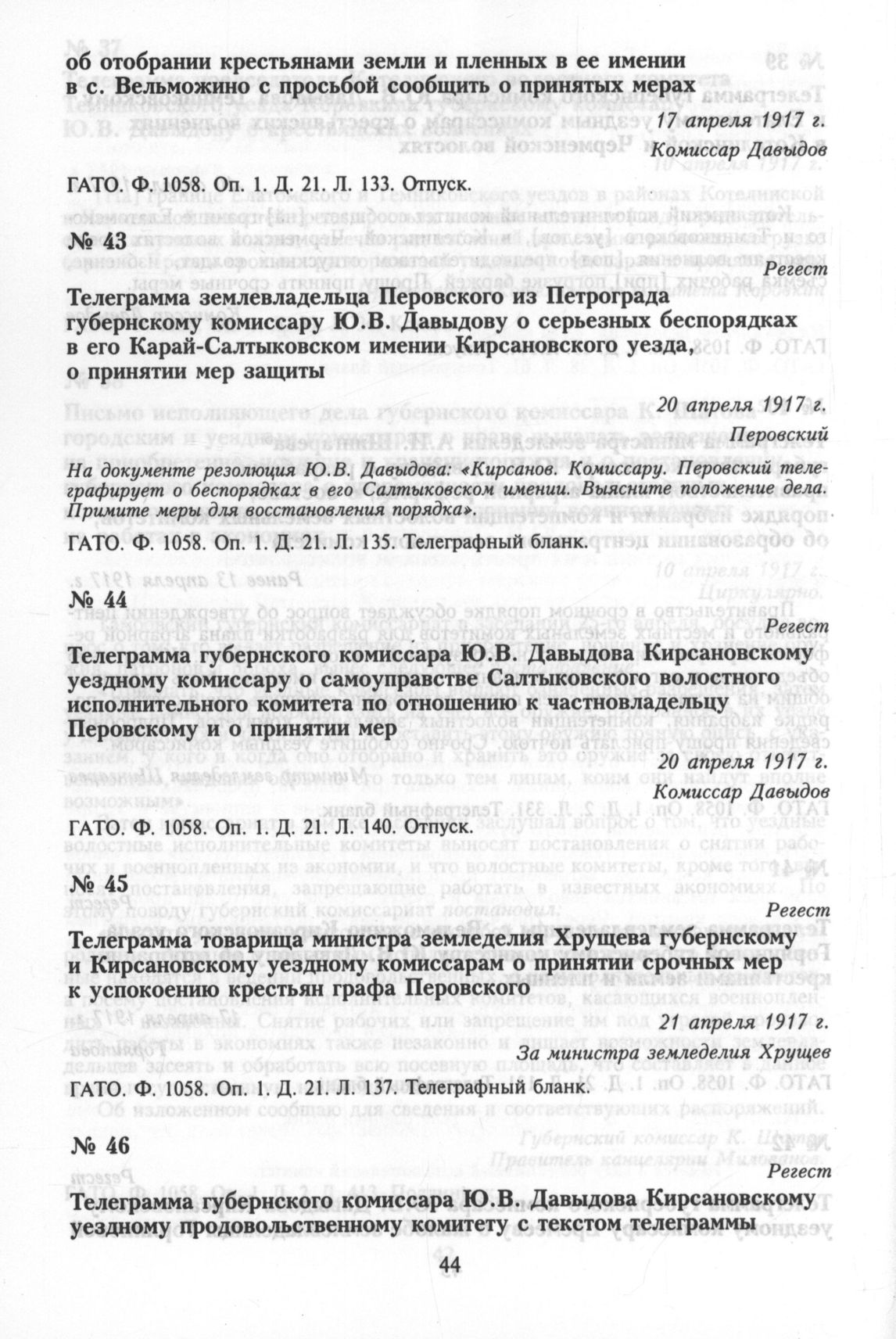 Телеграмма землевладельца Перовского из Петрограда губернскому комиссару Ю.В. Давыдову о серьезных беспорядках в его Карай-Салтыковском имении Кирсановского уезда, о принятии мер защиты. 20 апреля 1917 г.