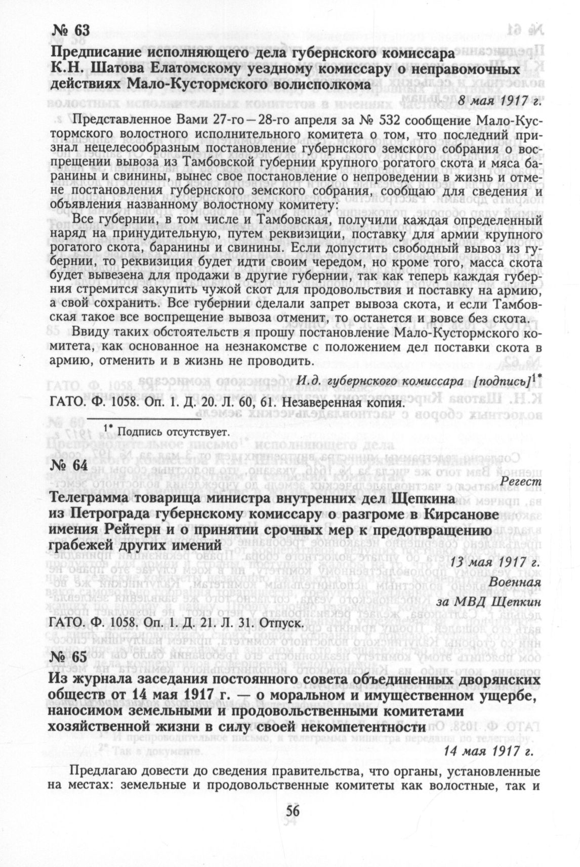 Телеграмма товарища министра внутренних дел Щепкина из Петрограда губернскому комиссару о разгроме в Кирсанове имения Рейтерн и о принятии срочных мер к предотвращению грабежей других имений. 13 мая 1917 г. // ГАТО. Ф. 1058. Оп. 1. Д. 21. Л. 31. Отпуск.