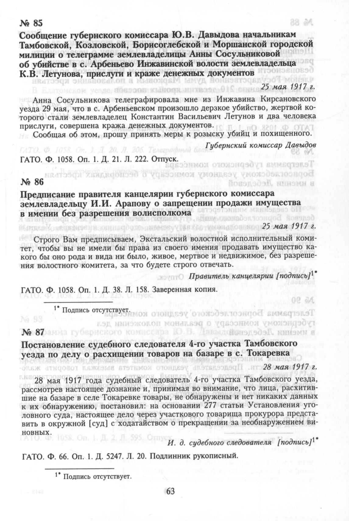 Сообщение губернского комиссара Ю.В. Давыдова начальникам Тамбовской, Козловской, Борисоглебской и Моршанской городской милиции о телеграмме землевладелицы Анны Сосульниковой об убийстве в с. Арбеньево Инжавинской волости землевладельца К.В. Летунова, прислуги и краже денежных документов. 25 мая 1917 г. // ГАТО. Ф. 1058. Оп. 1. Д. 21. Л. 222. Отпуск.