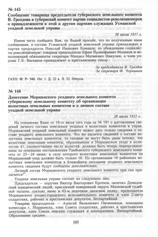 Сообщение товарища председателя губернского земельного комитета В. Гроздова в губернский комитет партии социалистов-революционеров о принадлежности к этой и другим партиям служащих Усманской уездной земельной управы. 28 июля 1917 г. // ГАТО. Ф. Р-946. Оп. 1. Д. 22 а. Л. 32. Отпуск.