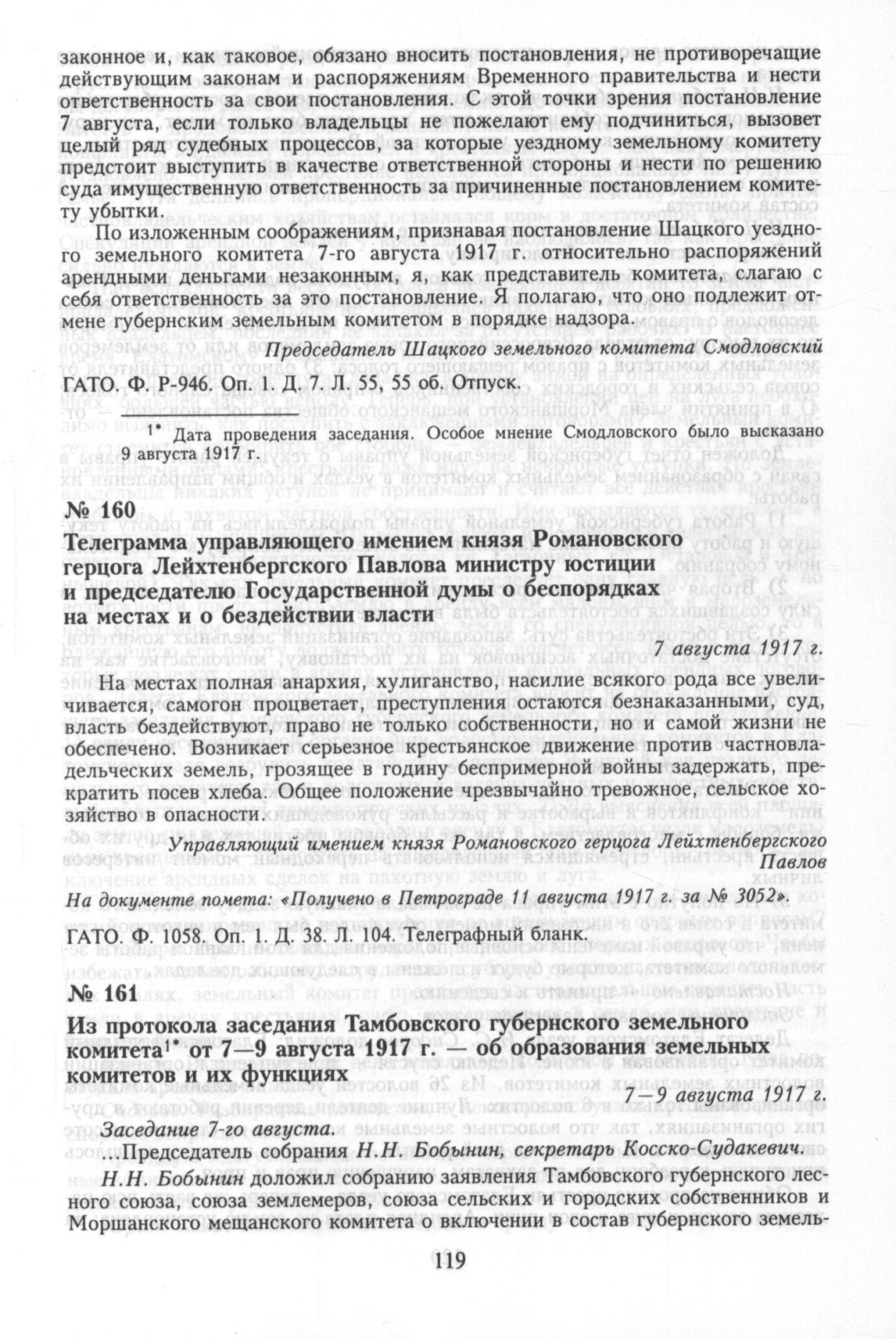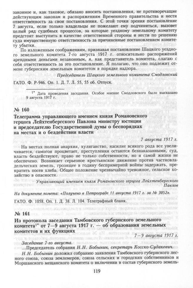 Телеграмма управляющего имением князя Романовского герцога Лейхтенбергского Павлова министру юстиции и председателю Государственной думы о беспорядках на местах и о бездействии власти. 7 августа 1917 г.