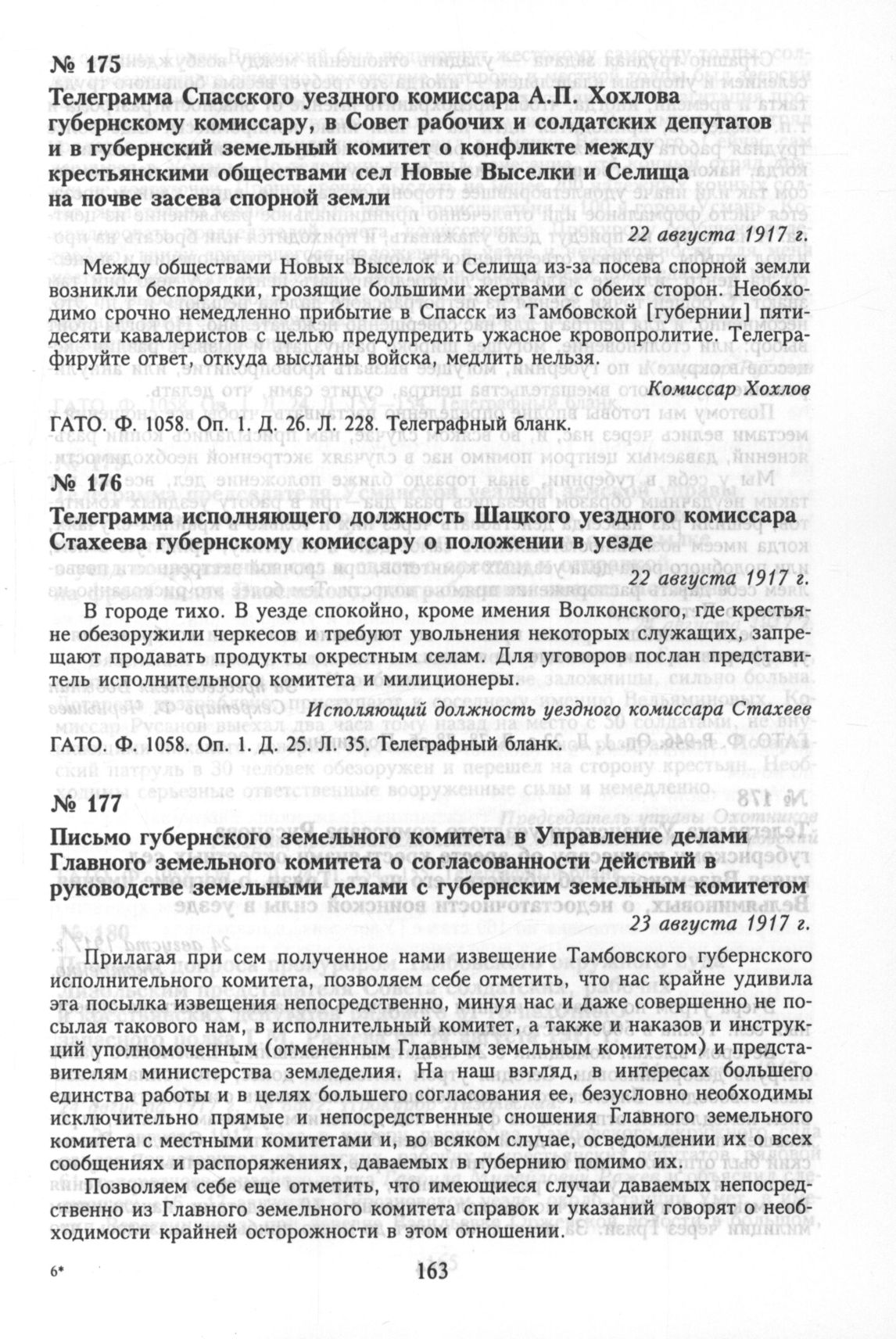 Телеграмма Спасского уездного комиссара А.П. Хохлова губернскому комиссару, в Совет рабочих и солдатских депутатов и в губернский земельный комитет о конфликте между крестьянскими обществами сел Новые Выселки и Селища на почве засева спорной земли. 22 августа 1917 г.
