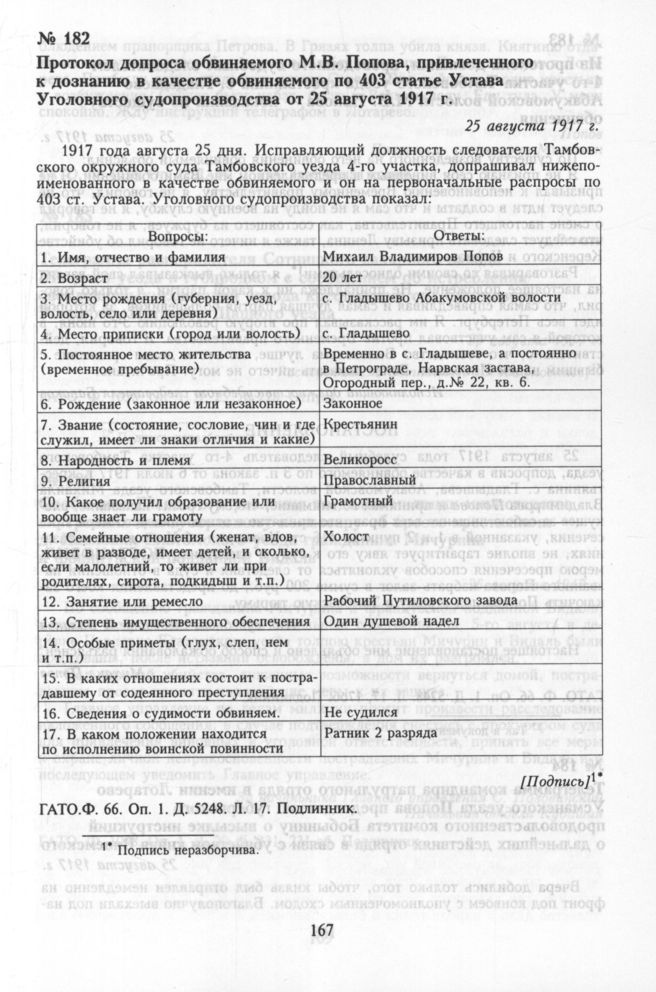 Протокол допроса обвиняемого М.В. Попова, привлеченного к дознанию в качестве обвиняемого по 403 статье Устава Уголовного судопроизводства от 25 августа 1917 г. // ГАТО. Ф. 66. Оп. 1. Д. 5248. Л. 17. Подлинник.