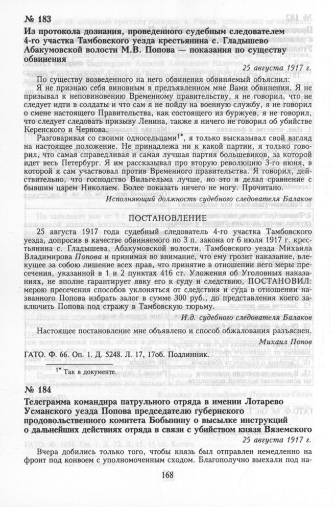 Из протокола дознания, проведенного судебным следователем 4-го участка Тамбовского уезда крестьянина с. Гладышево Абакумовской волости М.В. Попова — показания по существу обвинения. 25 августа 1917 г. // ГАТО. Ф. 66. Оп. 1. Д. 5248. Л. 17, 17об. Подлинник.