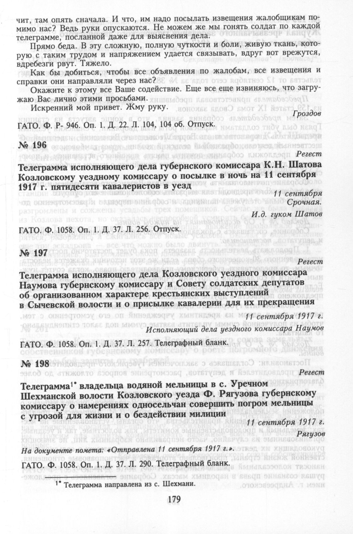 Телеграмма владельца водяной мельницы в с. Уречном Шехманской волости Козловского уезда Ф. Рягузова губернскому комиссару о намерениях односельчан совершить погром мельницы с угрозой для жизни и о бездействии милиции. 11 сентября 1917 г.