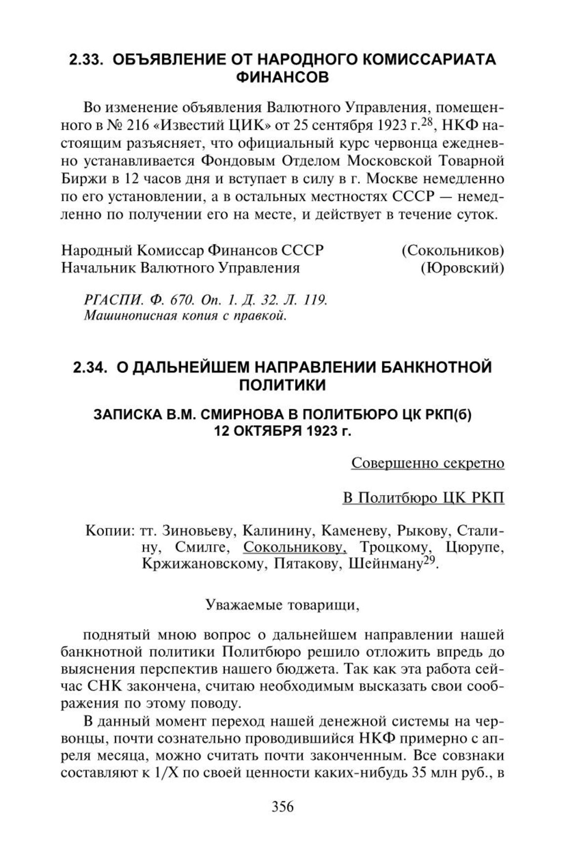О дальнейшем направлении банкнотной политики. Записка В.М. Смирнова в Политбюро ЦК РКП(б). 12 октября 1923 г. // РГАСПИ. Ф. 760. Оп. 1. Д. 30. Лл. 74-76 об. Подлинник. Подпись В. Смирнова - автограф. Публикуется впервые.