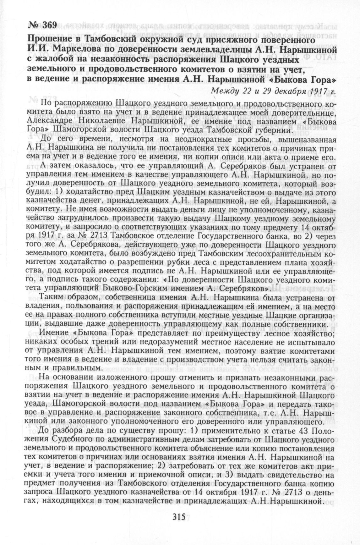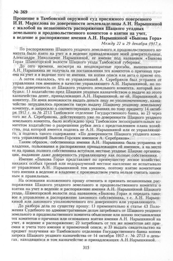 Прошение в Тамбовский окружной суд присяжного поверенного И.И. Маркелова по доверенности землевладелицы А.Н. Нарышкиной с жалобой на незаконность распоряжения Шацкого уездных земельного и продовольственного комитетов о взятии на учет, в ведение и распоряжение имения А.Н. Нарышкиной «Быкова Гора». Между 22 и 29 декабря 1917 г. // ГАТО. Ф. 1058. Оп. 1. Д. 81. Л. 10, 10 об. Заверенная копия.