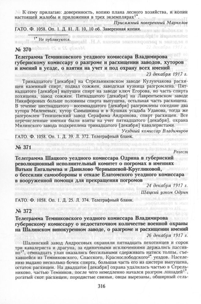 Телеграмма Шацкого уездного комиссара Одрина в губернский революционный исполнительный комитет о погромах в имениях Ватьки Енгалычева и Данилово Чернышевой Кругликовой, о бессилии самообороны и отказе Елатомского уездного комиссара в вооруженной помощи для прекращения погромов. 24 декабря 1917 г.
