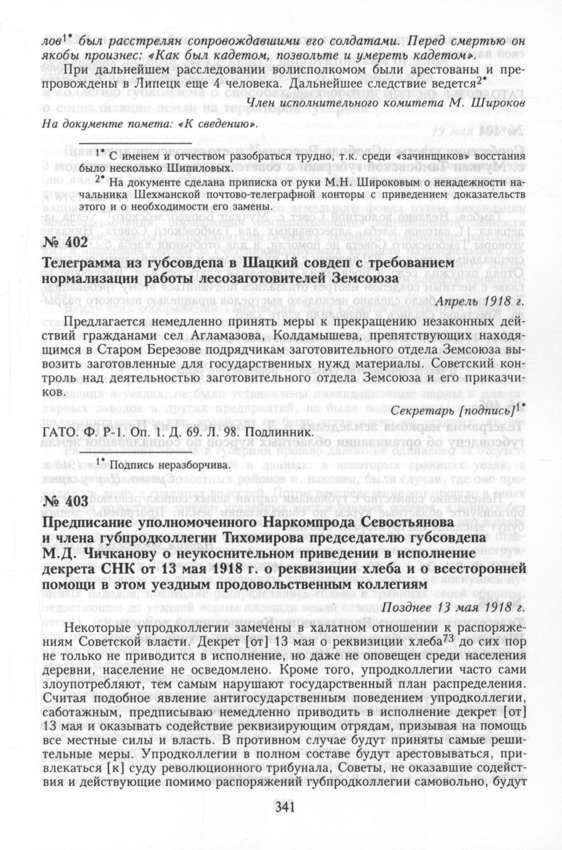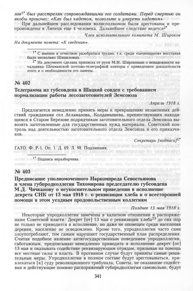 Предписание уполномоченного Наркомпрода Севостьянова и члена губпродколлегии Тихомирова председателю губсовдепа М.Д. Чичканову о неукоснительном приведении в исполнение декрета СНК от 13 мая 1918 г. о реквизиции хлеба и о всесторонней помощи в этом уездным продовольственным коллегиям. Позднее 13 мая 1918 г. // ГАТО. Ф. P-1. Оп. 1. Д. 30. Л. 30. Копия.