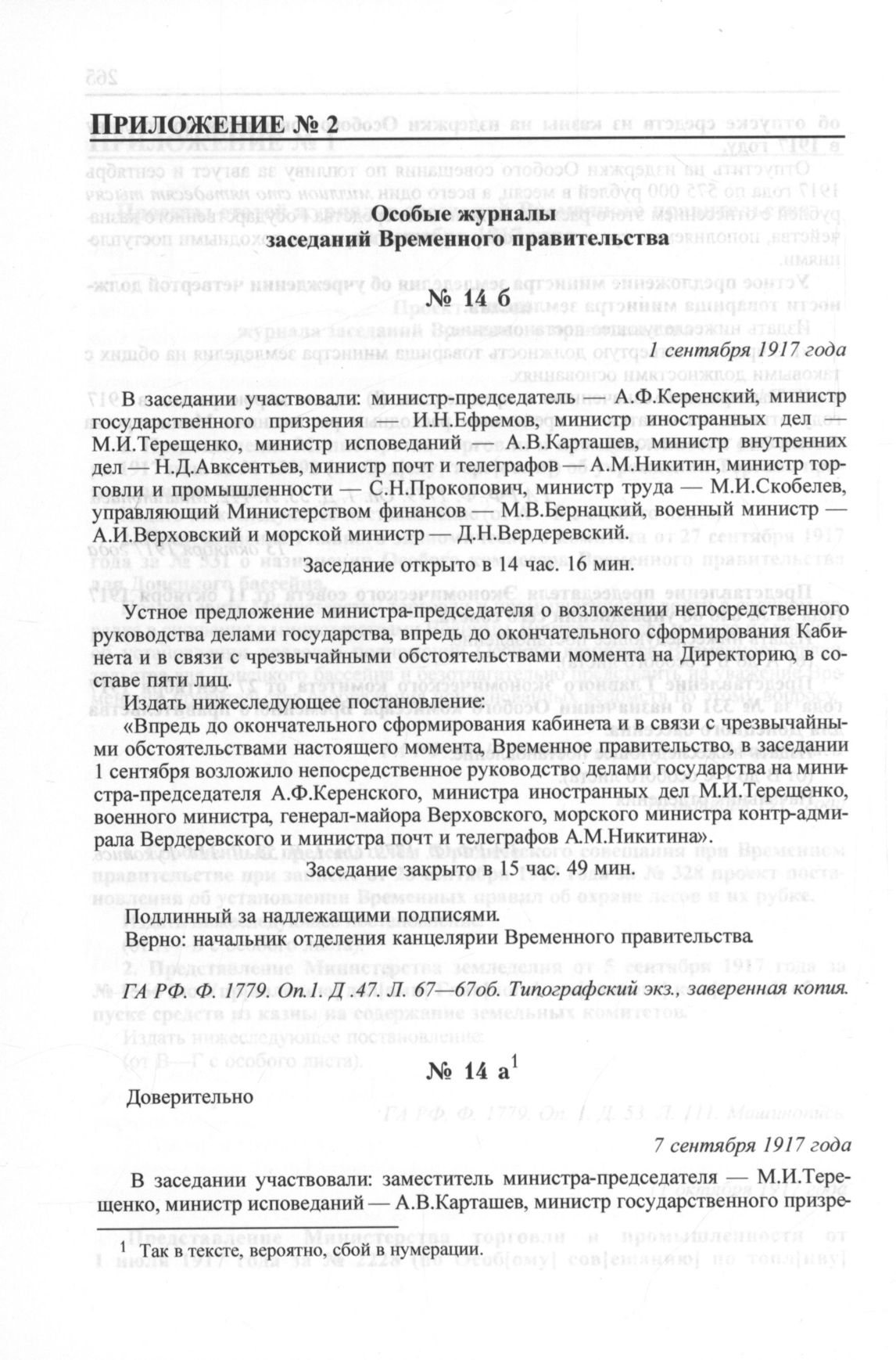 Особый журнал заседания Временного правительства № 14 а. Доверительно. 7 сентября 1917 года // ГА РФ. Ф. 1779. Оп. 2. Д. 4. Л. 188—190. Машинопись, подлинник.