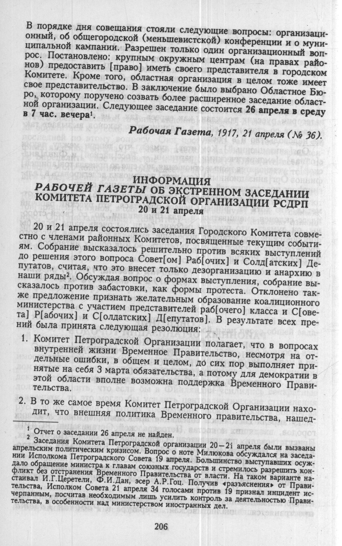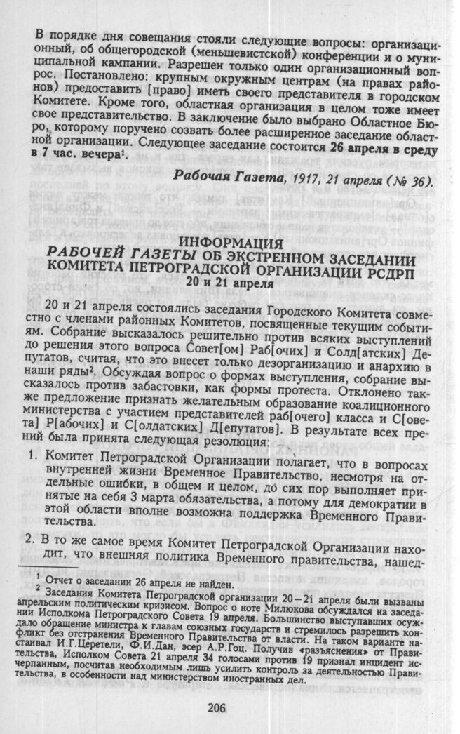 Информация Рабочей Газеты об экстренном заседании Комитета Петроградской Организации РСДРП 20 и 21 апреля // Рабочая Газета, 1917, 22 апреля (№ 37).