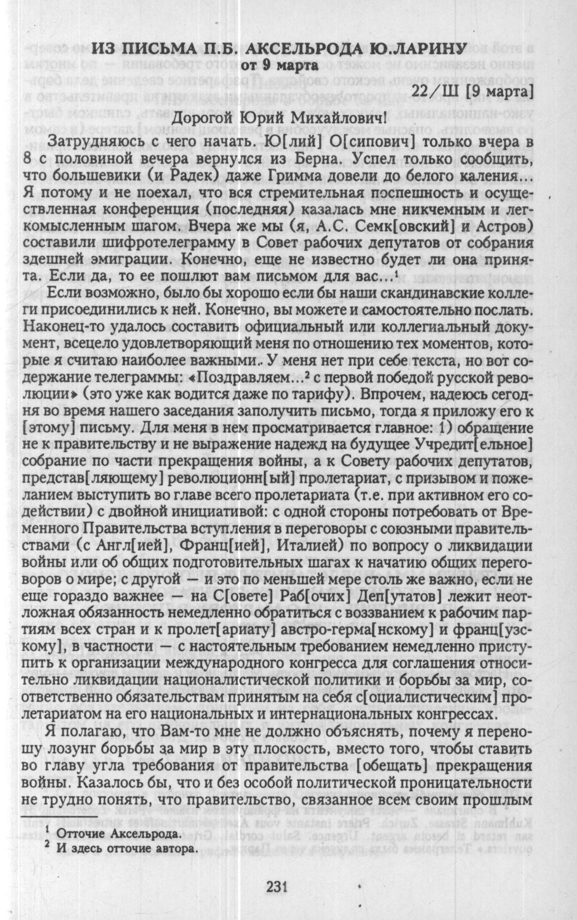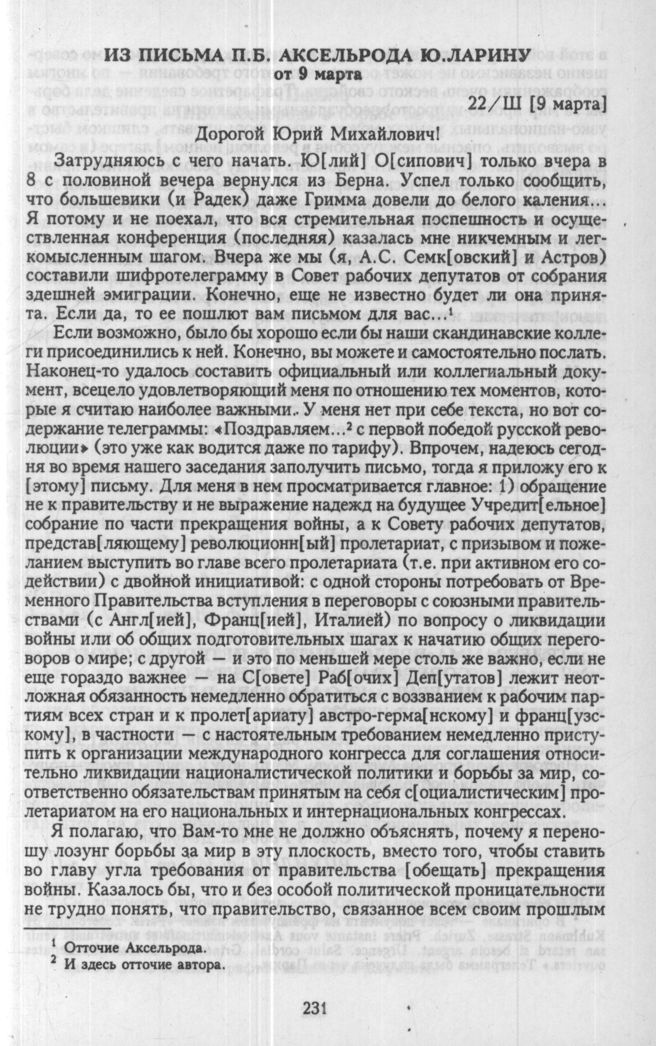Из письма П.Б. Аксельрода Ю. Ларину. 22/III [9 марта] // РЦХИДНИ, ф. 361, oп. 1, д. 32, лл. 1-4.
