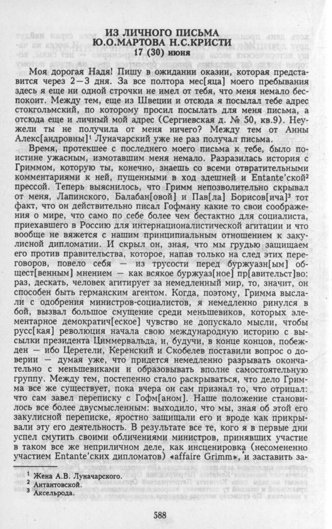 Главная Серия «Политические партии России. Конец XIX – первая треть ХХ века... Меньшевики в 1903—1931 гг. Меньшевики в 1917 году. В 3 т. Т. 1. От января до июльских событий Документы Из личного письма Ю.О. Мартова Н.С. Кристи из Петрограда 17 июня