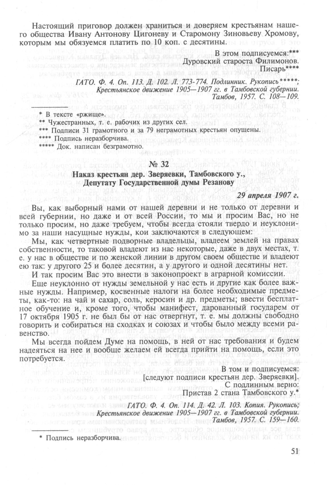 Наказ крестьян дер. Зверяевки, Тамбовского у., Депутату Государственной думы Резанову. 29 апреля 1907 г. // ГАТО. Ф. 4. Оп. 114. Д. 42. Л. 103. Копия. Рукопись; Крестьянское движение 1905-1907 гг. в Тамбовской губернии. Тамбов, 1957. С. 159-160.