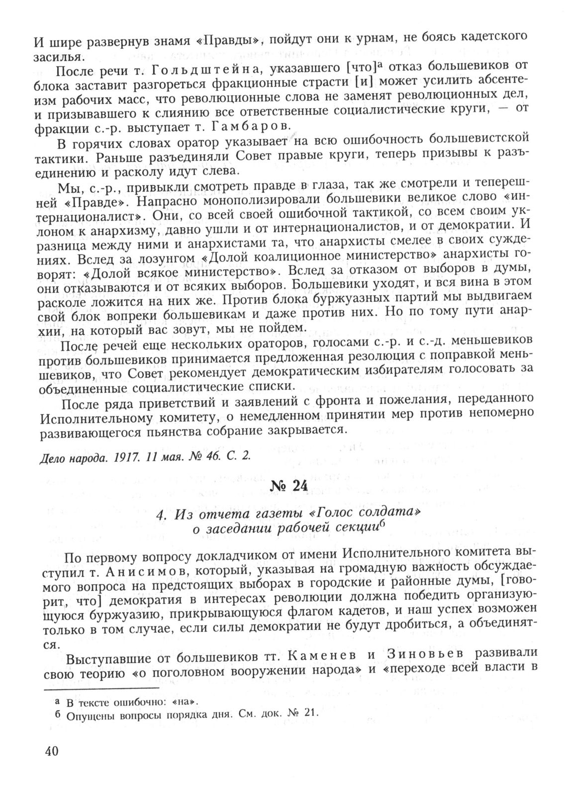 10 мая. IV. Заседание рабочей секции. 4. Из отчета газеты «Голос солдата» о заседании рабочей секции // Голос солдата. 1917. 11 мая. № 6. С.4.