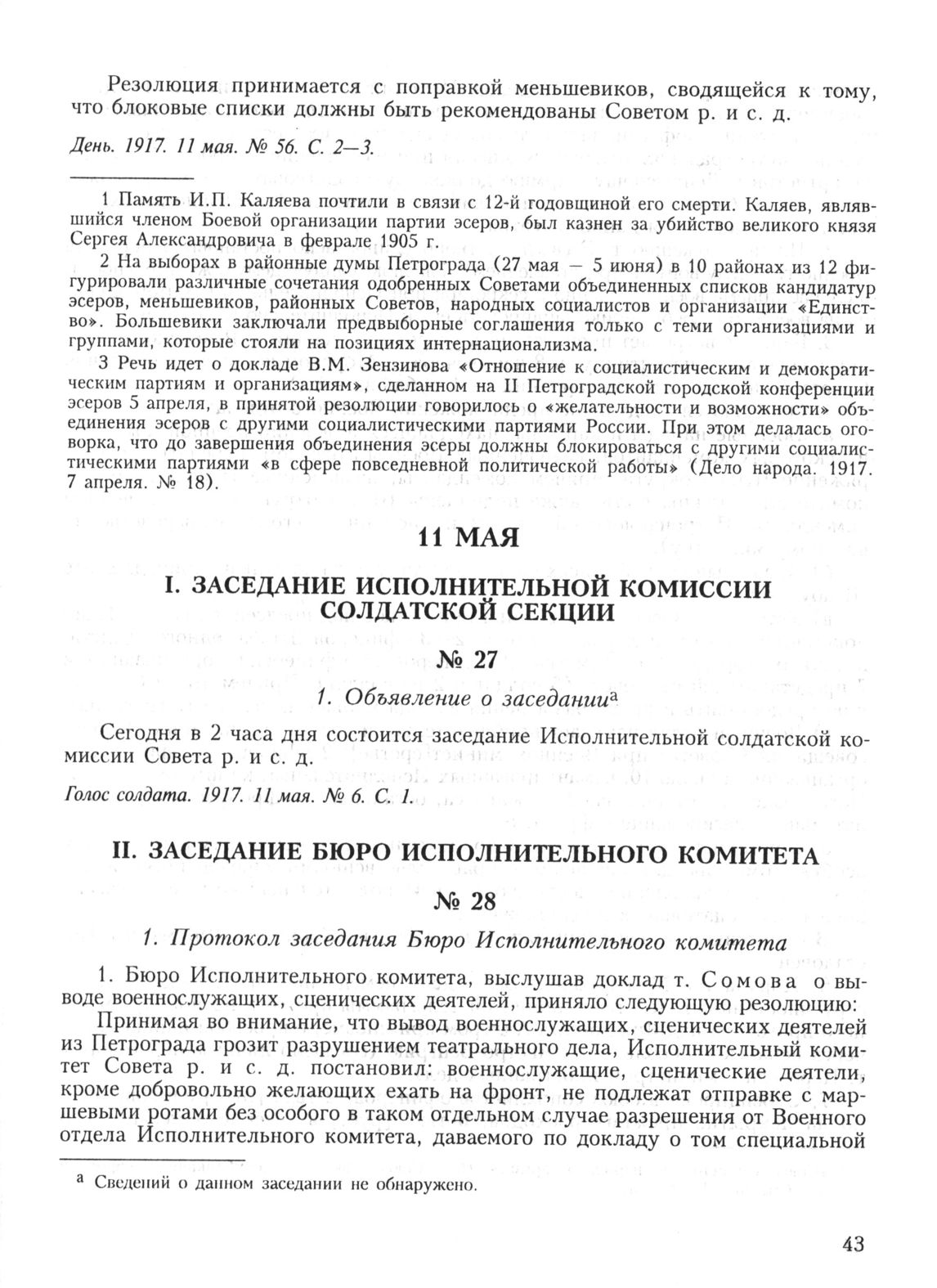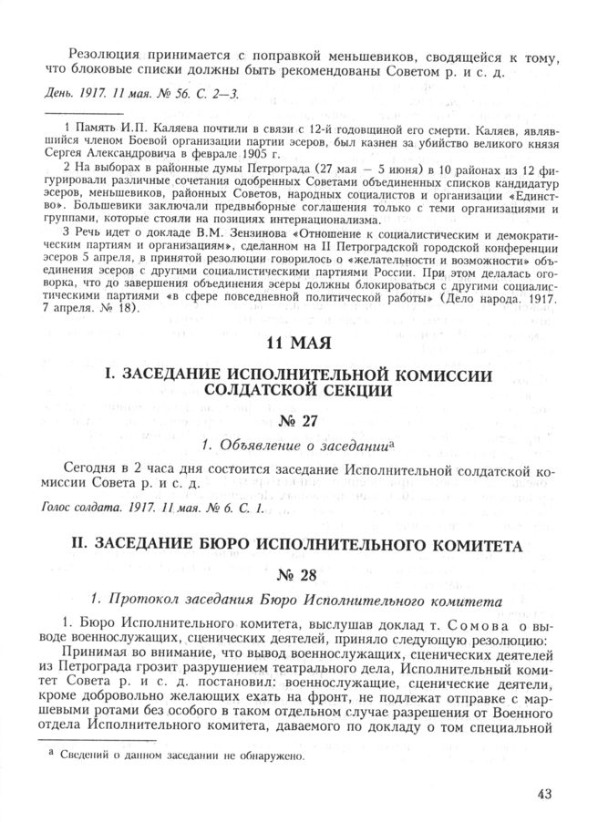 11 мая. I. Заседание Исполнительной комиссии солдатской секции. 1. Объявление о заседании // Голос солдата. 1917. 11 мая. № 6. С. 1.