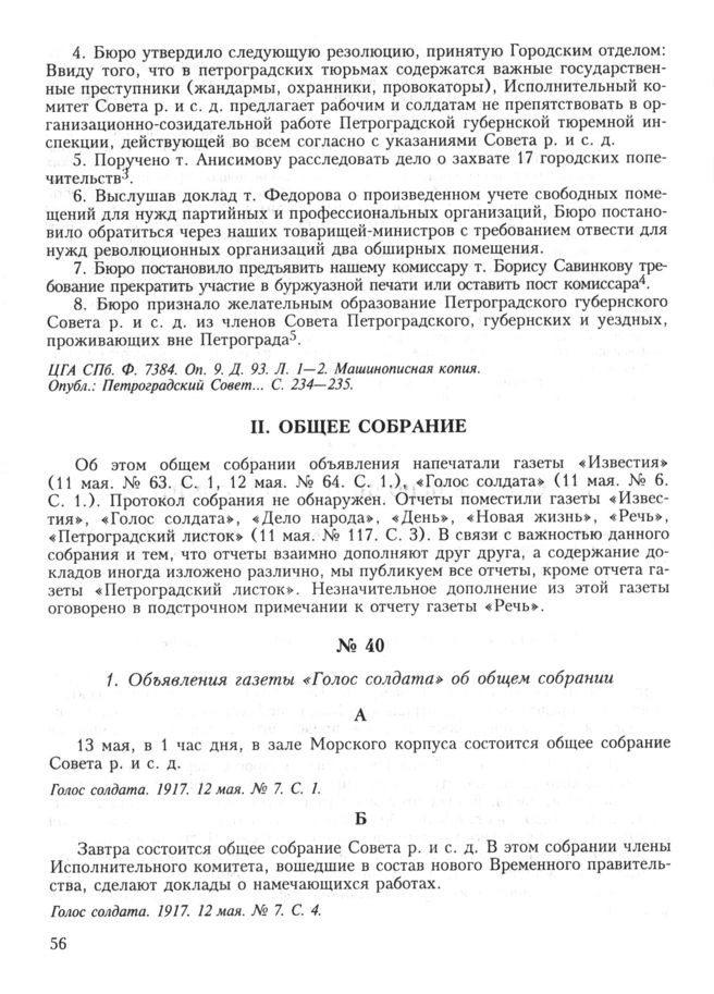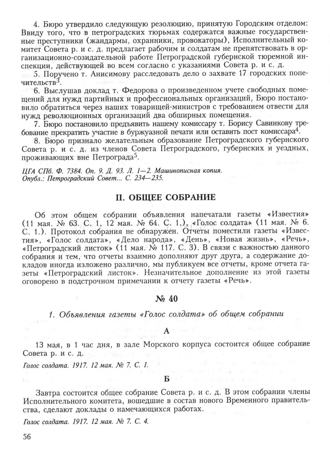 Петроградский Совет рабочих и солдатских депутатов в 1917 году: Протоколы, стенограммы и отчеты, резолюции и постановления общих собраний, собраний секций, заседаний Исполнительного комитета, Бюро Исполнительного комитета и фракций (27 февраля — 25 октября 1917 года). Т. 3 (6 мая — 2 июля 1917 года). — М.: РОССПЭН, 2002.