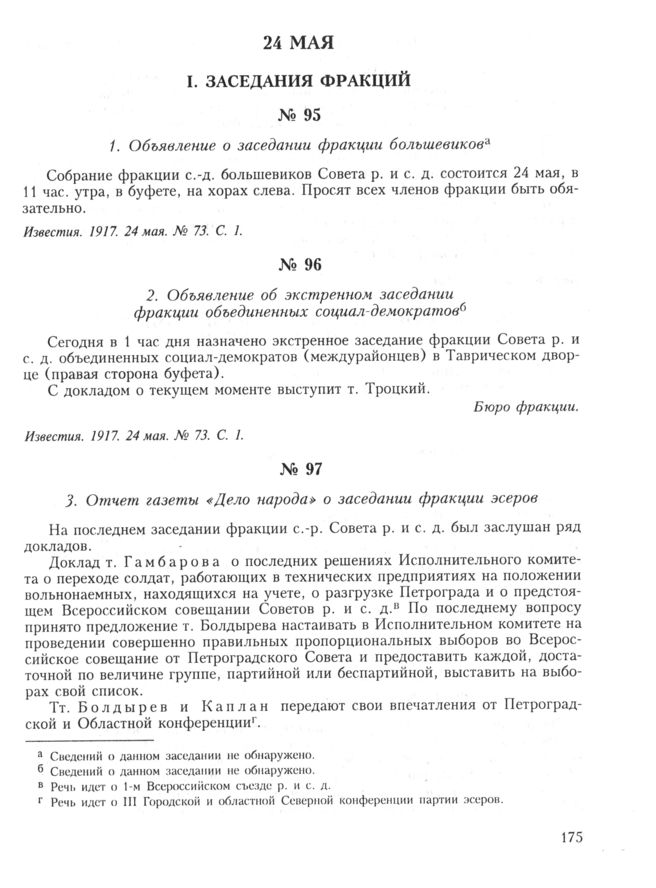 24 мая. I. Заседания фракций. 1. Объявление о заседании фракции большевиков // Известия. 1917. 24 мая. № 73. С. 1.